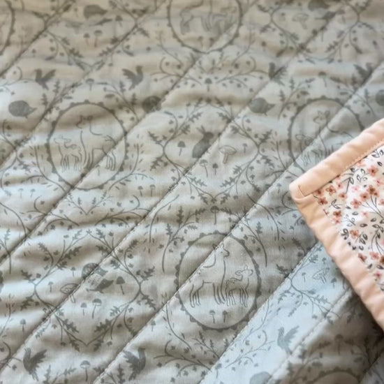 Measuring 35" x 41", the Wholecloth Wildflower Quilt features a light pink front with a captivating wildflower pattern that evokes the charm of a flourishing meadow. The backing fabric, adorned with grey deer and forest animals, adds a touch of whimsy and depth to the design.